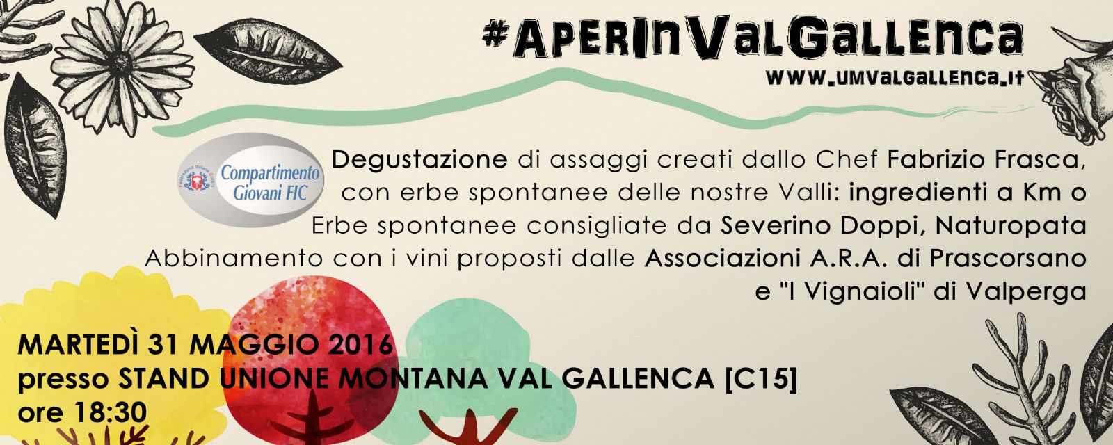 Evento "#aperinvalgallenca" che si terrà Martedì 31 Maggio presso lo Stand dell'Unione Montana "VAL GALLENCA" durante l'inaugurazione della "Nuova fiera del Canavese".