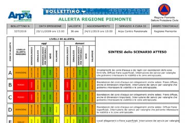 Si allega il bollettino meteo n. 327 del 23.11.2019, pervenuto a questo Comune dalla Città Metropolitana di Torino - Direzione Protezione Civile, il quale evidenzia un codice di allerta ROSSO con...