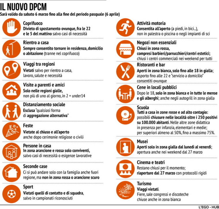 Con nuovo DPCM del 2 marzo 2021, sono state stabilite le nuove regole per fronteggiare l'emergenza dovuta all'epidemia portata dal virus COVID-19, che sono entrate in vigore dal 6 marzo e resteranno valide fino al 6 aprile 2021.