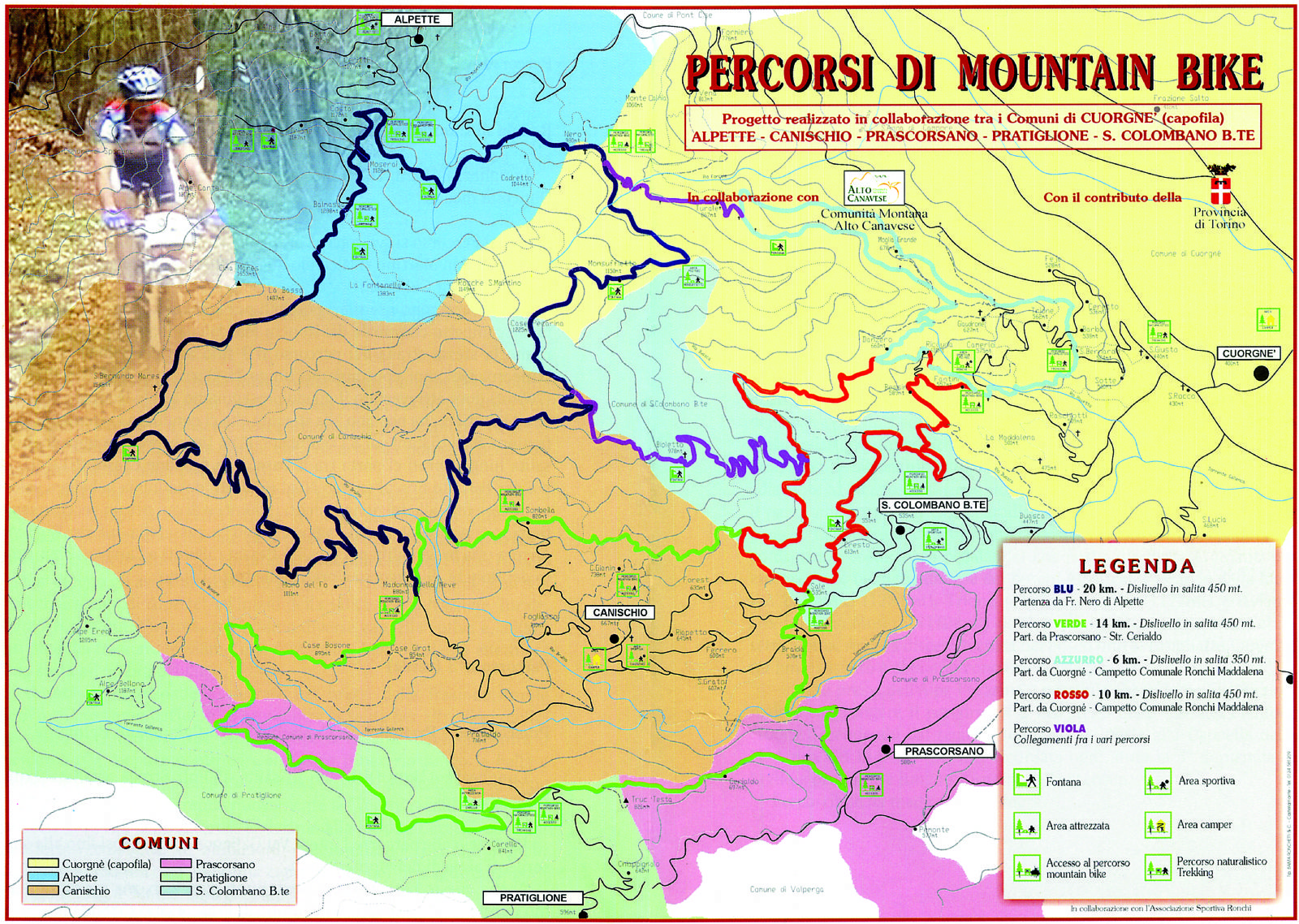 Mappa degli Itinerari "Mountain Bike" nel territorio della Ex Comunità Montana Alto Canavese.