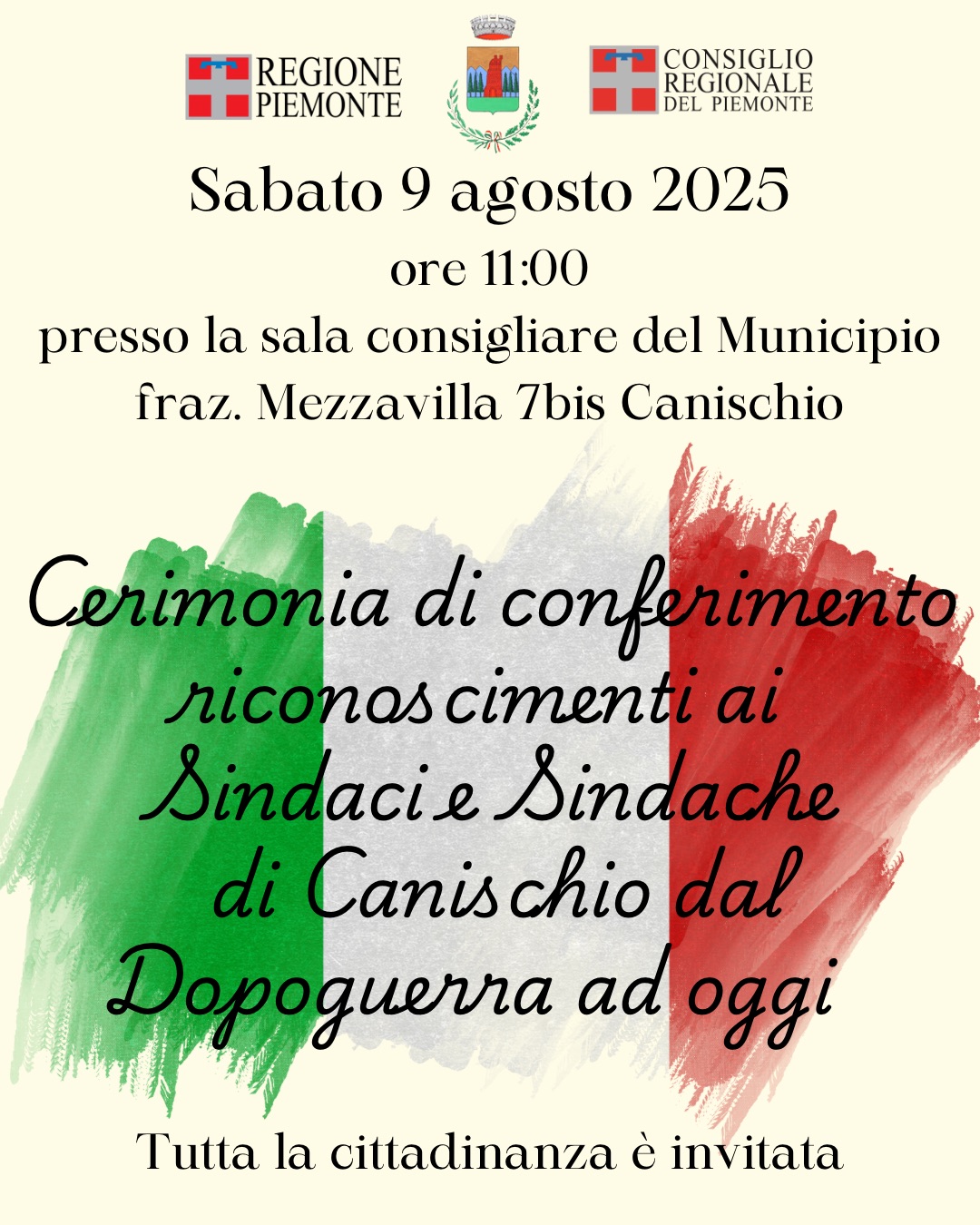 Su iniziativa promossa dal Presidente della Regione Piemonte e dal Consiglio regionale del Piemonte, Sabato 9 agosto 2025, in occasione della Festa patronale, verranno consegnati dei riconoscimenti agli ex Sindaci e famigliari degli ex Sindaci in carica dal dopoguerra ad oggi.