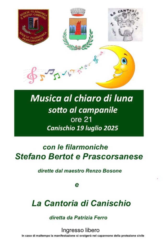 Rassegna musicale nella piazza antistante la Chiesa parrocchiale di San Lorenzo, ospiti: la Filarmonica "Stefano Bertot" di Canischio, la Filarmonica Prascorsanese e "La Cantoria" di Canischio.