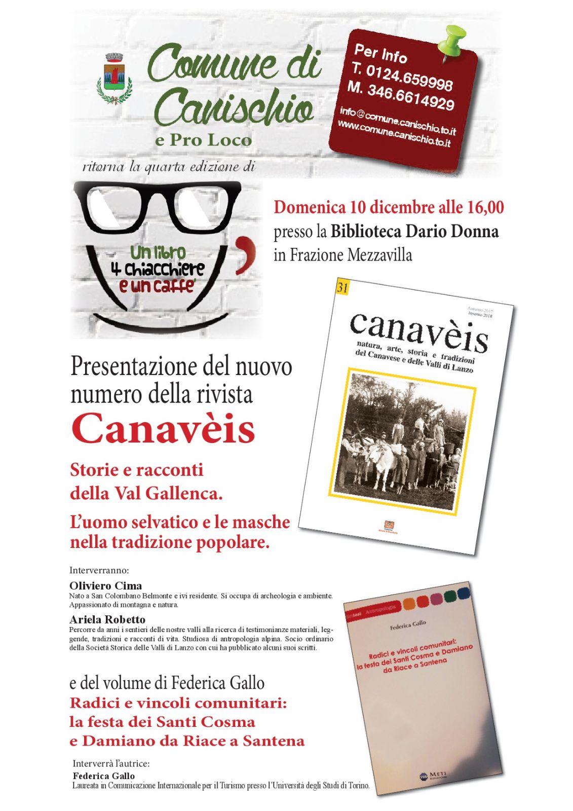 Domenica 10 Dicembre, dalle ore 16.00, presso la Biblioteca Comunale "Dario Donna", Vi sarà la presentazione del nuovo numero della rivista "Canavèis" e del Volume della giovane autrice, Federica Gallo, "Radici e vincoli comunitari..." tratto dalla Sua tesi di laurea.