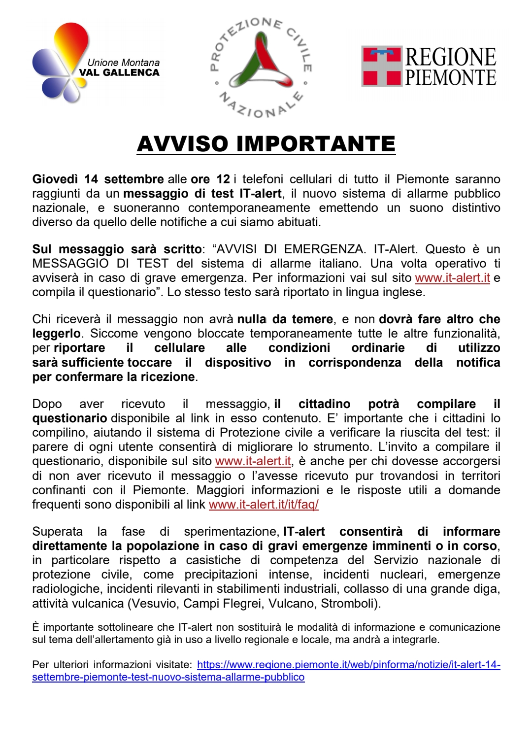 Giovedì 14 settembre 2023 alle ore 12 i telefoni cellulari di tutto il Piemonte saranno raggiunti da un messaggio di test IT-alert, il nuovo sistema di allarme pubblico nazionale e suoneranno contemporaneamente. -