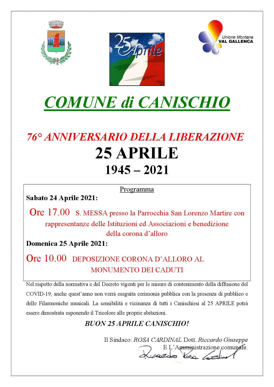 Il programma per la manifestazione del "25 APRILE" anche quest'anno sarà svolto in forma ridotta, senza cerimonia pubblica e senza la presenza delle filarmoniche musicali di Canischio e Prascorsano.
