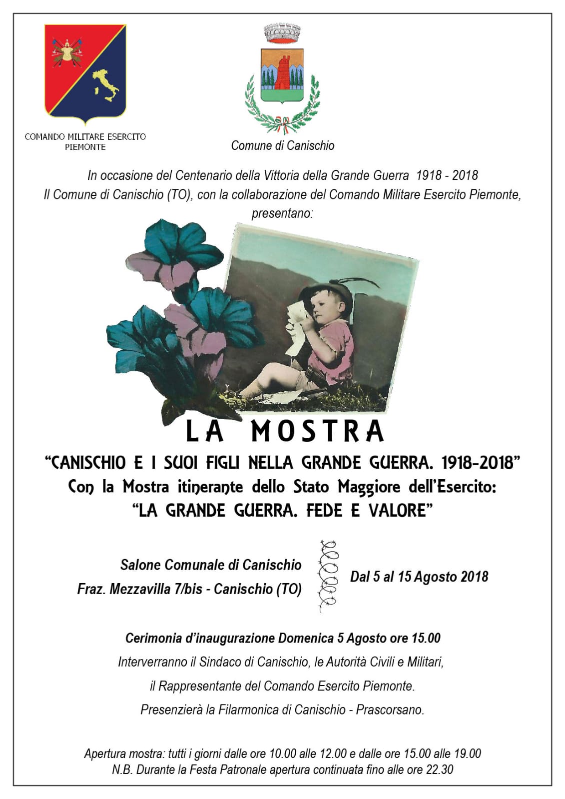 L'Amministrazione comunale di Canischio con il coordinamento del Comando Esercito Piemonte organizza una Mostra per commemorare il Centenario dalla Fine della I Guerra Mondiale, dal titolo "CANISCHIO E I SUOI FIGLI NELLA GRANDE GUERRA. 1918-2018". L'inaugurazione avverrà Domenica 5 agosto con un Convegno di apertura, a partire dalle ore 15.00.
