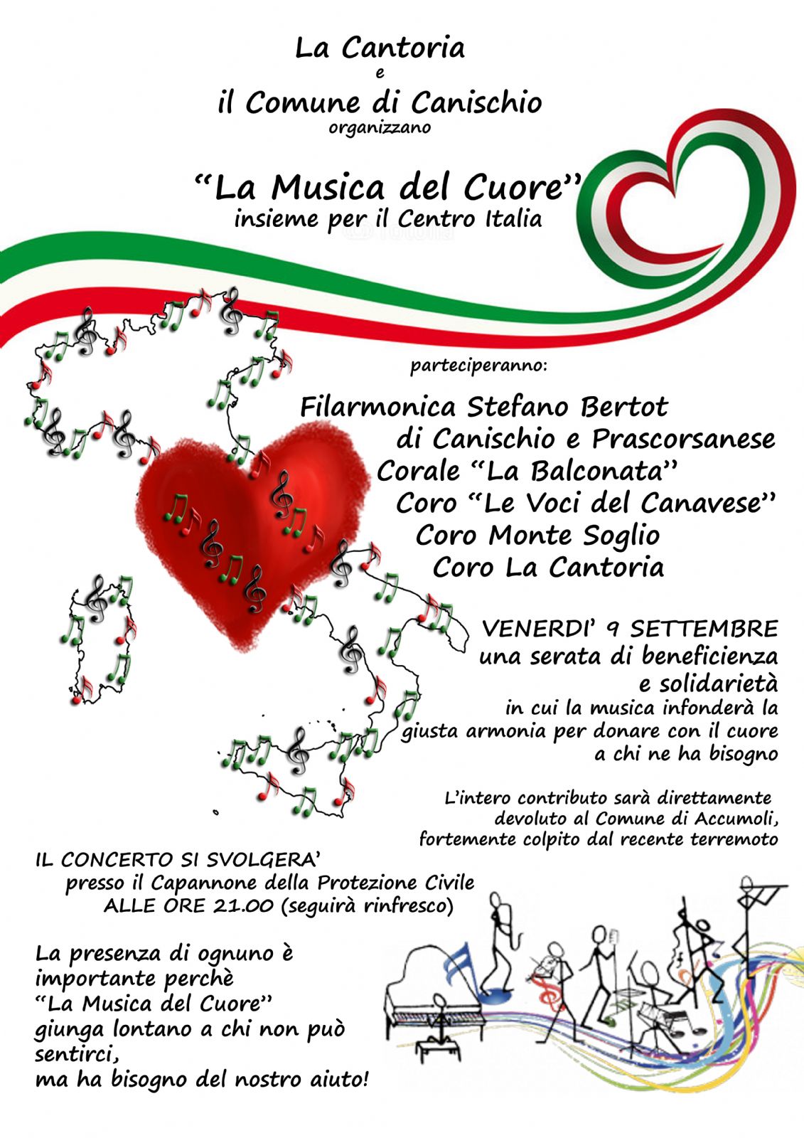 Venerd' 9 Settembre, alle ore 21.00, presso la tenso-struttura della Protezione civile di Canischio, si terrà un concerto che vedrà esibirsi alcune corali e cantorie locali e la Filarmonica musicale di "Canischio-Prascorsano", con l'obiettivo di trascorrere una serata di fine estate in armonia e solidarietà.