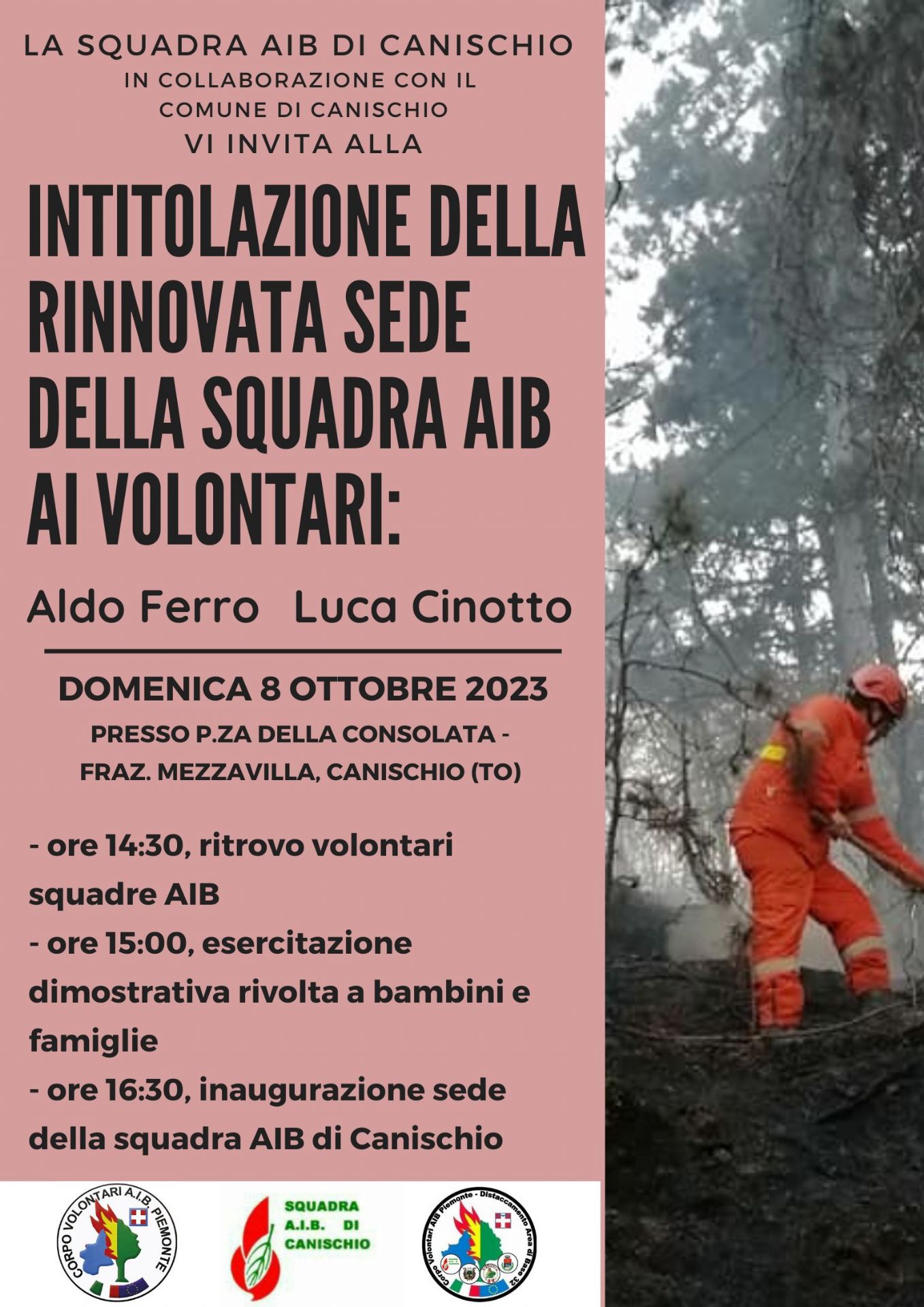 Nel pomeriggio di Domenica 8 ottobre 2023, la squadra A.I.B. di Canischio intitolerà la rinnovata sede a due suoi volontari prematuramente scomparsi. La manifestazione comincerà con una dimostrazione/esercitazione rivolta a bambini e famiglie.